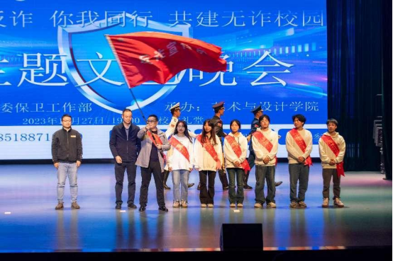 晚会现场,省社会治安重点工作专班综合组组长、省委政法委扫黑除恶与重大专项工作处处长李鸿、省教育厅学校安全稳定工作处四级调研员唐荣为学校反诈宣传队授队旗。