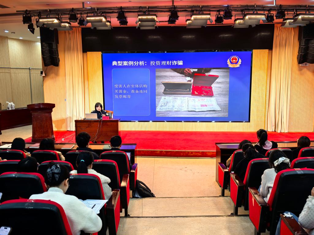 为深入推进校园反诈宣传工作,切实提升辅导员队伍防范电信网络诈骗的宣传教育与应急处置能力,依托“贵职安学堂”平台,2026年3月23日下午14:30,党委保卫工作部、学生工作部在图书馆二楼报告厅举办了防范电信网络诈骗辅导员专题培训。本次培训特邀贵阳市观山湖区公安分局侦查中心办案民警董玉蓉担任主讲,各二级学院学生科负责人、全体专(兼)职辅导员参加了培训。