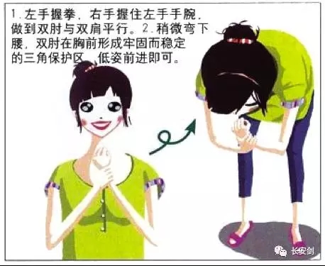 3 .在拥挤的人群中,左手握拳,右手握住左手手腕,双肘撑开平放胸前,以形成一定空间保证呼吸;两手十指交叉相扣、护住后脑和颈部;两肘向前,护住双侧太阳穴。